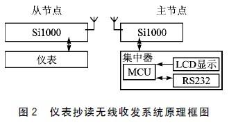 儀表抄讀無線收發(fā)系統(tǒng)原理框圖如圖2所示。無線數(shù)據(jù)的收發(fā)由無線微控制器Si1000實(shí)現(xiàn)。主節(jié)點(diǎn)Si1000內(nèi)部的發(fā)送模塊將數(shù)據(jù)進(jìn)行編碼處理,以特定的格式經(jīng)天線發(fā)送給接收模塊。從節(jié)點(diǎn)Si1000內(nèi)部的接收模塊接收到有效數(shù)據(jù)后,Si1000內(nèi)部的微處理器通過擴(kuò)展接口讀取外部儀表的數(shù)據(jù),并進(jìn)行相應(yīng)的調(diào)整、轉(zhuǎn)換處理后通過射頻發(fā)送給主節(jié)點(diǎn)。主節(jié)點(diǎn)通過GPRS與集抄中心進(jìn)行通信。