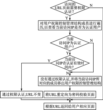 為了應(yīng)用時操作的安全性,本文將訪問的頁面分成兩類:一類為配置操作頁面,僅供認(rèn)證用戶訪問;另一類為設(shè)備狀態(tài)頁面,可供任何用戶訪問。其控制主要是通過對用戶IP的判別及訪問頁面的分類來實現(xiàn)的。首先對用戶訪問的URL進(jìn)行解析,如果訪問對象為配置操作頁面,則需要進(jìn)行認(rèn)證,在此通過一個用戶權(quán)限控制管理結(jié)構(gòu)來對通過權(quán)限認(rèn)證的用戶進(jìn)行維護(hù),并提供一個時間控制機(jī)制,使通過認(rèn)證的用戶在一定時間段內(nèi)可持續(xù)有效的對服務(wù)器進(jìn)行訪問。如果當(dāng)前客戶端(訪問者IP)在用戶權(quán)限控制結(jié)構(gòu)內(nèi),且未超時,則通過認(rèn)證,由服務(wù)器根據(jù)本次申請的URL返回相應(yīng)頁面;若超時則需要對本次訪問的URL進(jìn)行重定向,返回密碼校驗頁面,給用戶提供密碼輸入的接口。如果訪問頁面為設(shè)備狀態(tài)頁面,則無需進(jìn)行認(rèn)證,直接由URL返回相應(yīng)頁面即可。訪問權(quán)限認(rèn)證程序流程如圖4所示。