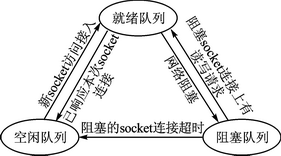 當(dāng)程序每次監(jiān)聽到新的socket連接訪問接入時,首先對空閑隊列進(jìn)行判斷,如果為空,則申請一個request結(jié)構(gòu)空間,并將其插入就緒隊列的隊頭,否則可直接將一個結(jié)構(gòu)空間從空閑隊列轉(zhuǎn)入;對當(dāng)前正在處理的就緒隊列成員,當(dāng)網(wǎng)絡(luò)阻塞時則將其移入阻塞隊列的隊頭,當(dāng)訪問結(jié)束斷開連接時,則將該成員的空間信息移入空閑隊列;而當(dāng)對阻塞隊列進(jìn)行輪詢時,根據(jù)其成員所對應(yīng)的socket上是有讀寫請求還是該連接已超時,分別將其移入就緒隊列或斷開連接移入空閑隊列。