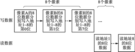 數(shù)據(jù)寫入SRAM存儲(chǔ)器中的組織方式有兩種:位平面法和組合像素法。位平面法是指像素的每一位分別存放在不同的存儲(chǔ)設(shè)備中;組合像素法是指畫面上每個(gè)像素的所有位均集中存放在單個(gè)存儲(chǔ)設(shè)備中。LED屏像素?cái)?shù)據(jù)每一位的權(quán)值是不同的,高位的權(quán)值高,也就意味著高位為1時(shí)LED的點(diǎn)亮?xí)r間要長(zhǎng)。根據(jù)兩種存儲(chǔ)結(jié)構(gòu)的特點(diǎn),對(duì)于LED屏,采用位平面結(jié)構(gòu)有利于提高LED屏的顯示效果,從而更容易實(shí)現(xiàn)D/T(data to time)轉(zhuǎn)換。位平面法的數(shù)據(jù)需要重新組織,利用位平面結(jié)構(gòu)有利于提高LED屏的顯示效果。數(shù)據(jù)重構(gòu)示意圖如圖2所示。