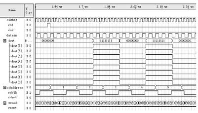 數(shù)據(jù)重構(gòu)后,通過QuartusⅡ軟件編譯,得出如圖3所示仿真波形。其中,當(dāng)col為1時(shí),表示已寫完上面8個(gè)地址的數(shù)據(jù),此時(shí)讀地址計(jì)數(shù)器開始計(jì)數(shù)。datain為串行輸入數(shù)據(jù),dout為串行輸出數(shù)據(jù)。
