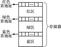 LED顯示屏的每個(gè)像素點(diǎn)都包括紅、綠、藍(lán)3種基色,每種顏色的灰度級(jí)均為256級(jí),即由8位數(shù)據(jù)對(duì)像素點(diǎn)灰度級(jí)進(jìn)行編碼,故每個(gè)像素點(diǎn)需要占用3字節(jié)的存儲(chǔ)空間。顯示時(shí),每個(gè)像素的紅管、綠管、藍(lán)管是同時(shí)點(diǎn)亮的,也就是說,3種顏色的數(shù)據(jù)是并行上屏的。據(jù)此,可將紅綠藍(lán)3種顏色對(duì)應(yīng)的數(shù)據(jù)分開存儲(chǔ),以方便操作。數(shù)據(jù)存儲(chǔ)方式如圖4所示。每種顏色的數(shù)據(jù)