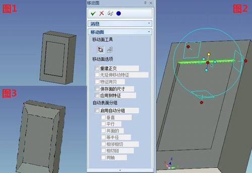 第一、在實體設計右側的設計元素庫中拖拽入長方體編輯包圍盒的尺寸為200、120、70。再從右側的設計元素庫中拖入孔內長方體放到長方體表面的中心修改尺寸為140、85、4。選中如圖2所示的面,并按鍵盤F10或者鼠標左鍵點擊三維球圖標的快捷鍵,空格鍵三維球與面脫離關聯(lián)并用點定位的方式移動到靠里邊的邊的中點,再拾取三維球的定向操作柄指向大的長方體的邊的中點。最后四個面分別用此操作形成如圖1、2、3所示。