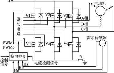 下面以一個三相繞組的無刷電機為例,簡要介紹其工作原理。圖2為三相全橋式驅(qū)動電路原理圖,對其采用二相通電的方式驅(qū)動,即有兩個繞阻同時通電。圖中包含6個晶體管、二極管組成的三相逆變電路,Ha、Hb、Hc為霍爾元件反饋的轉(zhuǎn)子位置信號??刂齐娐窌鶕?jù)位置信號決定6路PWM信號的通斷,進而使功率管導通或關(guān)斷,使繞阻按一定順序?qū)?,?qū)動電機連續(xù)旋轉(zhuǎn)。