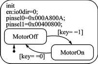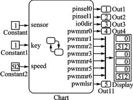 Stateflow狀態(tài)圖中的變量pinsel0、pinsel1、io0dir為芯片設(shè)置位,pwmmr0~pwmmr6聯(lián)合控制PWM輸出,sensor表示霍爾器件的值,key控制電機是否工作,變量speed用于接收外部的控制信號(例如電位器和ADC),調(diào)節(jié)PWM占空比,實現(xiàn)電機調(diào)速。