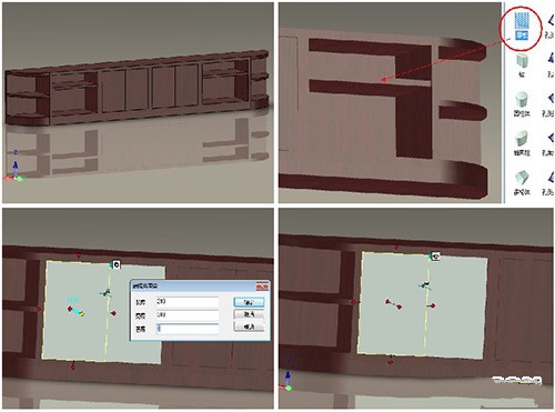 然后,打開CAXA實體設計事先做好的電視柜,柜子已經(jīng)完成大半,現(xiàn)在我將給這個電視柜配上毛玻璃。在右邊的元素庫里拉進一個【厚板】元素,選中后進入【包圍盒】狀態(tài),編輯尺寸,長和寬適配柜門尺寸,厚度尺寸可以靈活掌握,這里選擇的3;一個柜門配置兩塊毛玻璃,用三維球定位。確定后見圖2。