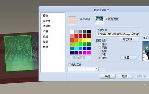 接下來,選中一塊玻璃的表面(變綠色),右鍵選擇【智能渲染】,在圖像文件選項下找到玻璃圖片保存的路徑,選擇圖片點擊確定。這樣,一塊玻璃就建成了,同樣的方法,將另外一塊玻璃渲染出來,如圖3所示。