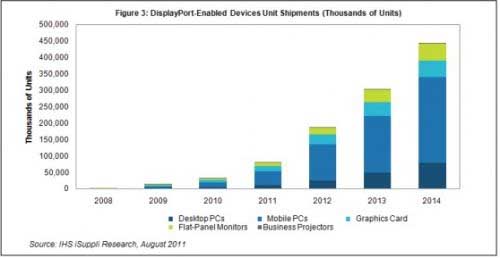 IHS iSuppli公司預(yù)計, 2014年DisplayPort設(shè)備的全球出貨量將從2010年的3100萬個增長到4.45億個以上,未來四年,多數(shù)OEM廠商和所有個人電腦CPU以及圖形處理單元(GPU)廠商將逐漸停止支持VGA連接器,DisplayPort在臺式電腦和移動PC市場的份額將迅速上升,這是其增長的主要動力。