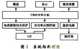 本系統(tǒng)原理如圖1所示,主要實現(xiàn)電流源驅(qū)動及保護、光功率反饋控制、恒溫控制、錯誤報警及鍵盤顯示等功能,整個系統(tǒng)由單片機控制。本系統(tǒng)中選用了C8051F單片機。C8051F單片機是完全集成的混合信號系統(tǒng)級芯片(SOC),他在一個芯片內(nèi)集成了構(gòu)成一個單片機數(shù)據(jù)采集或控制系統(tǒng)所需要的幾乎所有模擬和數(shù)字外設(shè)及其他功能部件,如本系統(tǒng)中用到的ADC和DAC。這些外設(shè)部件的高度集成為設(shè)計小體積、低功耗、高可靠性、高性能的單片機應(yīng)用系統(tǒng)提供了方便,也大大降低了系統(tǒng)的成本。光功率及溫度采樣模擬信號經(jīng)放大后由單片機內(nèi)部A/D轉(zhuǎn)換為數(shù)字信號,進行運算處理,反饋控制信號經(jīng)內(nèi)部D/A轉(zhuǎn)換后再分別送往激光器電流源電路和溫控電路,形成光功率和溫度的閉環(huán)控制。光功率設(shè)定從鍵盤輸入,并由LED數(shù)碼管顯示激光功率和電流等數(shù)據(jù)。