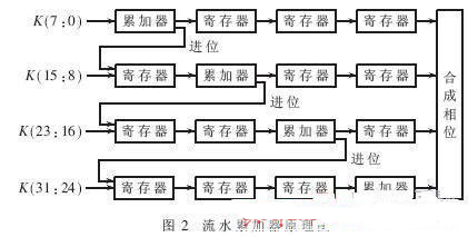 在用FPGA設計DDS電路時,相位累加器是決定DDS電路性能的一個關鍵部分。為使輸出波形具有較高的分辨率,本系統(tǒng)采用32位累加器。但若直接用32位加法器構成累加器,則加法器的延時會大大限制累加器的操作速度。因此,這里引入了流水線算法,即采用4個8位累加器級聯(lián)結構,每級用一個8位累加器實現(xiàn)該部分相位相加,然后將進位值傳給下一級做進一步累加。這樣可大幅提高系統(tǒng)的工作速度。但由于累加器是一個閉環(huán)反饋電路,因此必須使用寄存器,以保證系統(tǒng)的同步、準確運行。具體實現(xiàn)如圖2所示。