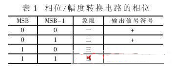相位/幅度轉換電路是DDS電路中的另一個關鍵部分,設計中面臨的主要問題就是資源的開銷。該電路通常采用ROM結構,相位累加器的輸出是一種數字式鋸齒波,通過取它的若干位作為ROM的地址輸入,而后通過查表和運算,ROM就能輸出所需波形的量化數據??紤]到正弦函數的對稱性:在[0,2π]內,正弦函數關于x=π成奇對稱,在[0,π]內,關于x=π/2成軸對稱。因此,在正弦查找表中只須存儲相位在[0,π/2]的函數值。這樣,通過一個正弦碼表的前1/4周期就可以變換得到整個周期碼表,節(jié)省了近3/4的資源,非??捎^。具體實現(xiàn)如表1所示,為節(jié)省ROM資源,取相位累加器輸出的高8位做為ROM的輸入地址,其中最高位(MSB)控制對輸出信號符號的處理,次高位(MSB-1)控制對輸入地址的處理。