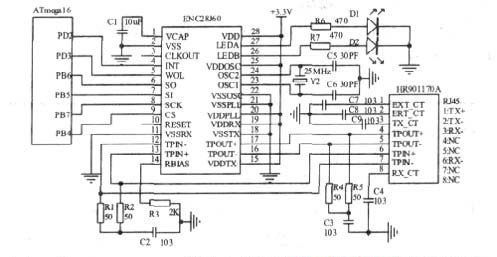 利用ENC28J60 可以構(gòu)成不同功能的網(wǎng)絡(luò)終端節(jié)點(diǎn), 如網(wǎng)絡(luò)服務(wù)器、帶Internet 功能的設(shè)備、遠(yuǎn)程監(jiān)控(數(shù)據(jù)采集, 診斷)設(shè)備等。圖2 所示為基于ENC28J60 的嵌入式網(wǎng)絡(luò)接口的硬件電路原理圖。電路中有:2 個(gè)LED 狀態(tài)指示燈主要用來(lái)顯示網(wǎng)絡(luò)連接狀態(tài), 包括PHY 是否沖突、連接是否建立、是否接收數(shù)據(jù)、連接速度、雙工模式等; 必需的偏置電阻R3(2kΩ, 精度為1%);高速局域網(wǎng)電磁隔離模塊(即RJ45 以太網(wǎng)接口), 應(yīng)用中,ENC28J60 的物理端口與隔離變壓器HR901170A 連接時(shí)必須符合IEEE802.3 對(duì)物理層規(guī)范的要求, 如RJ45 的插孔與隔離變壓器的間隔應(yīng)盡量小, 輸出和輸入差分信號(hào)對(duì)的走線要有很好的隔離。
