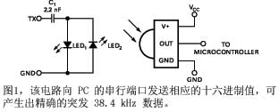 圖1中的電路與串行端口輸出阻抗和電容一起構(gòu)成了一個高通濾波器。正脈沖驅(qū)動一只紅外LED;負脈沖驅(qū)動另一只。兩只都應指向接收器。PC端口一般提供5mA~20mA的最大電流,以及±15V電壓,因此輸出電阻在數(shù)千歐姆范圍內(nèi)。一般不需要限流電阻。多數(shù)情況下,電容容量為1nF~10nF就可以了。接收器有寬容度。如果是非PC端口,則需要調(diào)整電容值,例如微控制器,因為它的阻抗較低。在實際應用中,如果LED對準接收器,用低至5mA的LED峰值電流就可以實現(xiàn)2米~4米的傳輸距離??商峁C的實例程序。