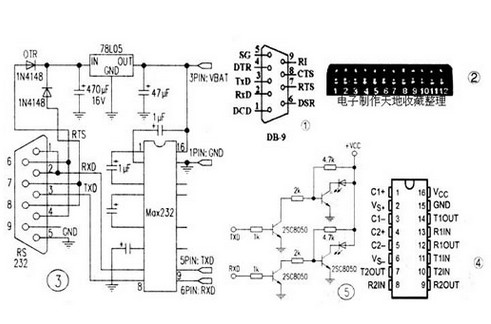 元件選擇: 本電路的核心為MAX232集成塊,常見的有兩種封裝,一種為雙列直插式,體積稍大,焊接方便;另一種為貼片式,體積較小。此外,如找不到MAX232,也可用MAX232A、 HIN232、MAX220、MAX3232、IL32等RS232收發(fā)器集成塊代替,管腳定義和MAX232相同,前兩種集成塊速度較快。78L05外表和普通三極管一樣,購買時要注意問清管腳定義。如發(fā)現(xiàn)發(fā)熱嚴重可用7805代替,或者用1V穩(wěn)壓管加接限流電阻代替。電容的焊接要注意分清正負極。濾波電容兩端并上一只0.1uF的CBB電容效果更好。4個參數(shù)電容最好選用鉭電容等優(yōu)質(zhì)電容,根據(jù)集成塊不同可選擇luF或O.1uF的容量。比較難找的是手機插頭,不過可以從同類型接口的廢舊充電器上取得,但要注意所有金屬針腳都要齊全的。電纜用帶屏蔽的6芯電纜。 以上材料可以在電子元器件商店或電腦網(wǎng)絡耗材店購得,10元左右就能買齊。