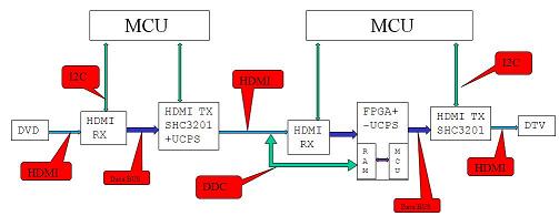 接收端系統(tǒng)工作方法:由于現(xiàn)還沒有UCPS的接收器,所以采用一種組合方式來實(shí)現(xiàn)UCPS接收功能。首先由一個(gè)HDMI接收器(無UCPS功能的HDMI接收器)接收SHC3201發(fā)送過來的加密視頻數(shù)據(jù),再將視頻數(shù)據(jù)送入FPGA中,F(xiàn)PGA板只做UCPS解密操作,F(xiàn)PGA解密后將視頻數(shù)據(jù)送入SHC3201(此處shc3201只是一個(gè)HDMI發(fā)送器,無UCPS功能)。SHC3201再將數(shù)據(jù)通過HDMI線送到DTV。整個(gè)系統(tǒng)工作結(jié)束。