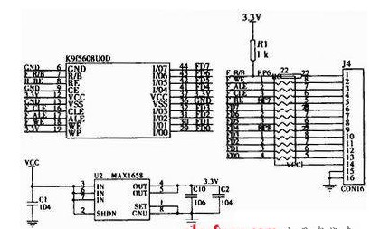 本設(shè)計(jì)的硬件連接電路如圖3所示。其中MAX1658為K9F5608UOD提供電源,排阻起到耦合限流作用。