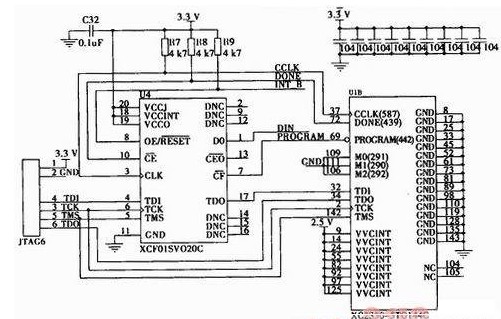 本設(shè)計(jì)的FPGA采用XILINX公司的Spartan-2系列的XC2S50,包括FPCA配置電路和FPGA時(shí)鐘電路及接口配置。