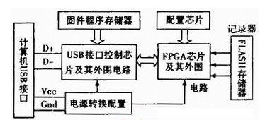 其工作原理是:FLASH模塊存儲(chǔ)數(shù)據(jù),作為記錄器的數(shù)據(jù)源;FPGA模塊作為讀數(shù)裝置的控制器,讀取FLASH的數(shù)據(jù)并傳輸給USB控制接口模塊;USB控制芯片接收來(lái)自上位機(jī)的命令,并與FPGA通信來(lái)執(zhí)行用戶需要的操作;電源模塊為各模塊提供穩(wěn)定電源。