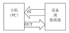 1. 標記包。USB 中所有事務都是由主機(PC)來完成的。IN 表示數(shù)據(jù)被讀入PC,OUT 表示數(shù)據(jù)由主機送出至設備,如圖6 所示。