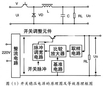 圖(1)畫(huà)出了開(kāi)關(guān)穩(wěn)壓電源的原理圖及等效原理框圖,它是由全波整流器,開(kāi)關(guān)管Vi,激勵(lì)信號(hào),續(xù)流二極管VD,儲(chǔ)能電感和濾波電容C組成。實(shí)際上,開(kāi)關(guān)穩(wěn)壓電源的核心部分是一個(gè)直流變壓器。這里我們對(duì)直流變換器和逆變器作如下解釋。逆變器,它是把直流轉(zhuǎn)變?yōu)榻涣鞯难b置。逆變器通常被廣泛地應(yīng)用在采用電平或電池組成的備用電源中。直流變換器,它是把直流轉(zhuǎn)換成交流,然后又把交流轉(zhuǎn)換成直流的裝置。這種裝置被廣泛地應(yīng)用在開(kāi)關(guān)穩(wěn)壓電源中。采用直流變換器可以把一種直流供電電壓變換成極性、數(shù)值各不同的多種直流供電電壓。