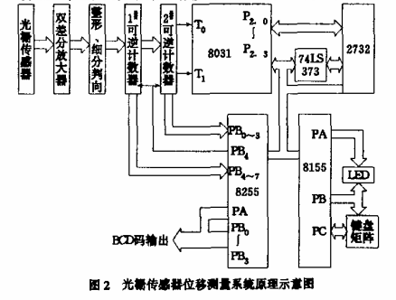 圖 2是利用光柵傳感器構(gòu)成的位移量自動(dòng)測(cè)量系統(tǒng)原理示意圖。該系統(tǒng)采用光柵移動(dòng)產(chǎn)生的莫爾條紋與電子電路以及單片機(jī)相結(jié)合來(lái)完成對(duì)位移量的自動(dòng)測(cè)量,它具有判別光柵移動(dòng)方向、預(yù)置初值、實(shí)現(xiàn)自動(dòng)定位控制及過(guò)限報(bào)警、自檢和掉電保護(hù)以及溫度誤差修正等功能。下面對(duì)該系統(tǒng)的工作原理及設(shè)計(jì)思想作以介紹。