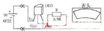 準(zhǔn)備好四個元件,再準(zhǔn)備好電烙鐵、焊錫絲、黑膠布、尖嘴鉗、電線等工具和輔助材料,用電烙鐵將元件按電路(下圖)焊接好,電池、LM35和電表表頭是有正負(fù)極性的,不要接反。注意電池最好用按扣連接,以便不用時將電池斷開,節(jié)約電力,延長電池壽命,以后更換電池也方便。電路連好后,就要進(jìn)行下面關(guān)鍵的一步:改動表頭,繪制刻度盤。