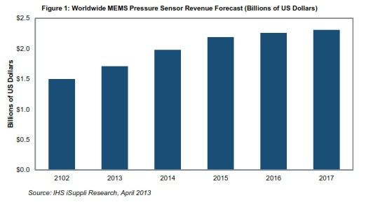 今年MEMS壓力傳感器營業(yè)收入預計將達17.1億美元,比2012年的15億美元增長14%。今年增長率將高于去年的11%,但明年前景預計更好,有望勁增16.2%。該領(lǐng)域?qū)⒈3诌B續(xù)增長,至少直到2017年,屆時該市場將達到23.1億美元,如圖1所示。