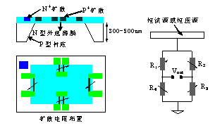 利用壓阻效應(yīng)原理,采用集成工藝技術(shù)經(jīng)過(guò)摻雜、擴(kuò)散,沿單晶硅片上的特定晶向,制成應(yīng)變電阻,構(gòu)成惠斯通電橋,利用硅材料的彈性力學(xué)特性,在同一硅材料上進(jìn)行各向異性微加工,就制成了一個(gè)集力敏與力電轉(zhuǎn)換檢測(cè)于一體的擴(kuò)散硅傳感器,如圖1所示。