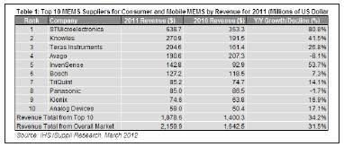 據(jù)IHS iSuppli公司的MEMS市場追蹤報告,2011年10大供應(yīng)商占消費(fèi)與移動MEMS器件市場總體營業(yè)收入的86%,蘋果公司的主要供應(yīng)商意法半導(dǎo)體在該領(lǐng)域遙遙領(lǐng)先。