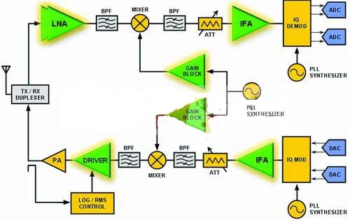 在通信基礎設施設備、雷達、RFID閱讀器、測控、消費電子、醫(yī)療設備的RF信號鏈(圖1)中,放大器(低噪聲放大器LNA,中頻放大器IFA,驅動放大器及增益模塊)是重要的器件。ADI公司最新推出覆蓋全部射頻信號鏈的12個放大器。這些放大器與功率檢測器、調制器、解調器、合成器產品相結合實現(xiàn)完整的信號鏈方案。ADI公司新的四個高性能射頻放大器家族產品包括LNA(低噪聲放大器)、IFA(中頻放大器)、驅動放大器和射頻增益模塊。
