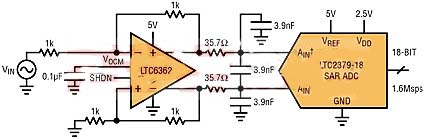不過,如果你想用單一 5V 電源軌給放大器供電,會(huì)發(fā)生什么情況呢? 你也許認(rèn)為,利用軌至軌運(yùn)算放大器,剛好有足夠的空間以擺動(dòng)在 0V 至 5V,但實(shí)際上你是做不到的。軌至軌輸出級并非是真正軌至軌的。這種輸出級充其量也只能達(dá)到與每個(gè)軌相差約 10mV 的電壓,而且這還是在硬限幅的情況下實(shí)現(xiàn)的,有時(shí)還會(huì)導(dǎo)致較慢的飽和恢復(fù)時(shí)間。如果需要良好的線性度 (低失真),那么輸出電壓通常應(yīng)該與每個(gè)軌相距至少數(shù)百毫伏。例如,新的低功率差分運(yùn)放 LTC6362 (參見圖 2) 用單一 5V 電源工作。其輸出可以擺動(dòng)至與任一電源軌相差約 100mV 的范圍,該器件在與任一軌相差 250mV 以內(nèi)時(shí),保持 >110dB 的線性度。如果你設(shè)計(jì)系統(tǒng)時(shí),讓感興趣的最大信號(hào)不超過這個(gè)范圍,那么就運(yùn)用了至少 90% 的 ADC 代碼,這意味著,你實(shí)現(xiàn)了與所申明的動(dòng)態(tài)范圍相差 1dB 的范圍。在很多情況下,這就是最好的解決方案了。實(shí)際上,這會(huì)讓人安心,因?yàn)槟阒婪糯笃鞅WC不會(huì)超過 (或惡化、損害) ADC 的輸入范圍。這自然而然起到了保護(hù)作用。