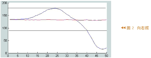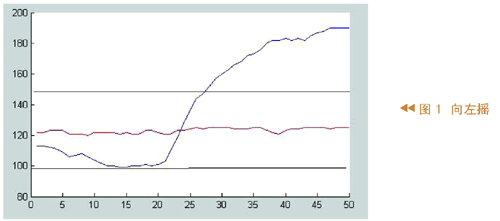 從圖1和圖2中可以看出,兩條黑線之間的數(shù)據(jù)很難斷定是哪個動作產(chǎn)生的,因為兩個動作都可能產(chǎn)生這樣的值。所以,利用黑線之外的數(shù)據(jù)來判定是向右還是向左搖。因為對于這兩個動作,黑線之外的數(shù)據(jù)有明顯的差異,數(shù)據(jù)相差很多。對于圖1這些數(shù)據(jù)大于150,圖2中這些數(shù)據(jù)小于90。因此這些數(shù)據(jù)至少相差60,可以很容易地將向左、向右的兩個動作區(qū)分開。