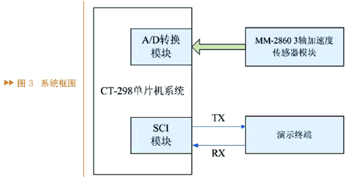 系統(tǒng)由三個部分組成:CT-298單片機控制部分、 MM-2860加速度傳感器部分、演示終端,系統(tǒng)框圖如圖3所示。