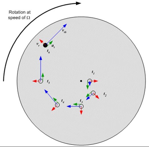 圖2. 科里奧利效應(yīng)中呈現(xiàn)的速度和加速向量。