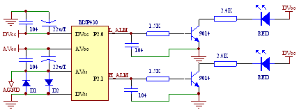 本系統(tǒng)的基本方案是這樣的:ADC12模塊的通道10對(duì)芯片的溫度進(jìn)行測(cè)量,當(dāng)測(cè)量溫度高于或者低于預(yù)設(shè)告警值時(shí),便通過(guò)I/O端口的輸出來(lái)驅(qū)動(dòng)LED,顯示告警狀態(tài)。芯片在整個(gè)過(guò)程中處于低功耗模式。本系統(tǒng)的原理比較簡(jiǎn)單,圖1給出其簡(jiǎn)單的原理圖。