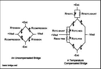 溫度導(dǎo)致零負(fù)載輸出電壓漂移(也稱為失調(diào)),在負(fù)載情況下使靈敏度出現(xiàn)變化(也定義為滿量程輸出電壓),對傳感器性能有不利的影響。傳感器生產(chǎn)商在電路中引入溫度敏感電阻,補(bǔ)償這些變化的一階影響,如圖3所示。當(dāng)溫度變化時,電阻RFSOTC和RFSOTC_SHUNT調(diào)制電橋激勵電壓。一般而言,RFSOTC材料有正溫度系數(shù),電橋激勵電壓隨溫度升高而降低。隨著溫度的提高,傳感器輸出對負(fù)載越來越敏感。降低電橋激勵電壓能夠減小傳感器輸出,有效地抵消內(nèi)在溫度效應(yīng)。電阻RSHUNT對溫度或者應(yīng)變不敏感,用于調(diào)整RFSOTC產(chǎn)生的TC補(bǔ)償量。0Ω的RSHUNT能夠抵消RFSOTC的所有影響,而無限大的值(開路)將使能RFSOTC的所有影響。該方法補(bǔ)償一階溫度靈敏度的效果非常好,但是不能解決更復(fù)雜的高階非線性效應(yīng)。通過在電橋的一臂上插入溫度敏感電阻來完成失調(diào)變化的溫度補(bǔ)償。這些電阻如圖3所示的ROTC_POS和ROTC_NEG。分流電阻(ROTC_SHUNT)調(diào)整ROTC_POS或者ROTC_NEG引入的溫度影響量。使用ROTC_POS或者ROTC_NEG取決于失調(diào)是正溫度系數(shù)還是負(fù)溫度系數(shù)。