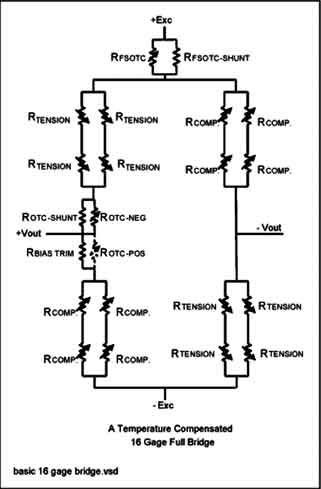另一種全有源電橋電路如圖3所示采用了四片以上有源350Ω應(yīng)變片。特征電橋電阻是350Ω,輸出靈敏度是2mV/V,應(yīng)變片在較大范圍內(nèi)采用了應(yīng)變材料。