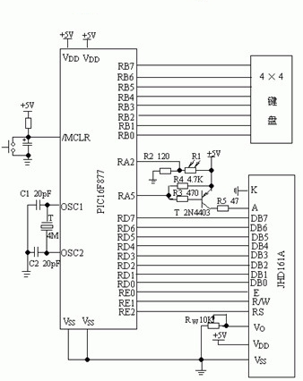 JHD161A液晶模塊是一種用5x7點陣圖形來顯示字符的液晶顯示器,是武漢博控科技有限公司生產的1行16個字符的LCD顯示模塊,它采用的控制芯片是三星電子公司生產KS0066驅動芯片。它采用16腳接口,其中VSS為地電源,VDD接5V正電源,V0為液晶顯示器對比度調整端,接正電源時對比度最弱,接地電源時對比度最高,對比度過高時會產生“鬼影”,使用時可以通過一個10K的電位器調整對比度(如圖1中的RW)。RS為顯示、指令選擇線,當RS為高電平時單片機向LCD模塊進行讀寫操作;E為數(shù)據(jù)接收、發(fā)送標志,每當E線向LCD模塊發(fā)送一個脈沖,LCD模塊與單片機之間將進行一次數(shù)據(jù)交換;R/W為讀寫選擇線,當RS和R/W同為低電平時可以寫入指令或者顯示地址,當RS為低電平R/W為高電平時可以讀忙信號,當RS為高電平R/W為低電平時可以寫入數(shù)據(jù)。E端為使能端,當E端由高電平跳變成 低電平時,液晶模塊執(zhí)行命令。A、K分別是LCD模塊背光的正負電源,如圖1所示,我們用AR5控制背光,改變R5的值將改變背光亮度。DB0~DB7依次與單片機的RD0~RD7連接,為8位雙向數(shù)據(jù)線。JHD161A LCD顯示器與PIC16F877單片機的連接圖見圖1