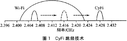 ①可靠。通過使用直接序列擴頻(DSSS)調制技術,CyFi能夠使傳輸?shù)臄?shù)據(jù)從可能的錯誤中恢復回來,從而提供出色的連接可靠性。對于來自同樣工作在非常擁擠的2.4 GHz頻段的Wi—Fi、藍牙、ZigBee等其他無線技術的干擾,CyFi的跳頻技術能以預設的頻段間隔自動搜索干凈的信道進行通信,如圖1所示。同時,CyFi的鏈接管理功能可以根據(jù)網(wǎng)絡環(huán)境將發(fā)射功率、傳輸速率自動調整到保證可靠鏈接的最優(yōu)配置上。DSSS調制、跳頻技術和成熟的鏈接管理算法使得 CyFi成為2.4 GHz頻段的高可靠性無線解決方案。