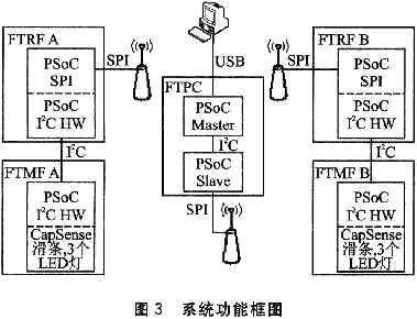 由于CyFi使用的是星型廣播式網(wǎng)絡協(xié)議,所有消息需要經過中心Hub,故實現(xiàn)節(jié)點A到節(jié)點B數(shù)據(jù)通信的過程如下:節(jié)點A通過I2C協(xié)議采集多功能板A的CapSense觸摸滑塊的位置、3個LED燈的亮滅情況等數(shù)據(jù),并與目標節(jié)點B的ID號一起通過RF發(fā)送出去;Hub檢測到網(wǎng)絡中有消息后,再根據(jù)消息中的目標節(jié)點ID將消息轉發(fā)出去,同時將數(shù)據(jù)保存到緩存中等待PC機讀取;節(jié)點B接收到消息之后根據(jù)消息中的數(shù)據(jù),同樣通過I2C協(xié)議控制多功能板B上的3個LED燈的亮滅。其中Hub所在設備FTPC有2個PSoC內核:主內核實現(xiàn)USB—I2C轉換和各個板卡(包括從內核)的編程功能;從內核實現(xiàn)Hub功能,同時通過I2C與主內核連接。系統(tǒng)功能框圖如圖3所示。