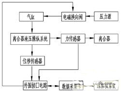 測試系統(tǒng)主要包括:計算機部分、接口電路部分、離合器液壓操縱系統(tǒng)和工作臺架。如圖1所示,測試系統(tǒng)利用空壓機氣源作為壓力源,經(jīng)電磁換向閥推動汽缸工作,汽缸操作離合器液壓操縱系統(tǒng)工作,位移傳感器、力傳感器的模擬量信號經(jīng)外圍信號調(diào)理通過數(shù)據(jù)采集卡送到計算機系統(tǒng),進行數(shù)據(jù)處理、圖形顯示、文件管理;同時計算機系統(tǒng)可以發(fā)出指令,通過數(shù)據(jù)采集卡經(jīng)外圍接口電路控制電磁換向閥工作,電磁換向閥控制汽缸的進退,從而控制離合器液壓操縱系統(tǒng)的工作,完成系統(tǒng)性能測試功能。