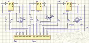 為了實現(xiàn)模擬量輸入和數(shù)字量的輸出,設(shè)計開發(fā)了外圍接口電路,即接口卡。外圍驅(qū)動電路如圖2所示,采集卡數(shù)字量輸出(DO)經(jīng)光電隔離模塊4N35,保證計算機系統(tǒng)與外圍電路相互隔離,4N35觸發(fā)功率模塊IRFP導(dǎo)通,IRFP功率模塊導(dǎo)通換向閥,從而控制汽缸的進、退,保證測試按計算機系統(tǒng)程序流程進行。