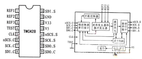TMC428采用16引腳封裝,是由各個(gè)單元的寄存器和片內(nèi)RAM構(gòu)成的。其內(nèi)部包括二個(gè)外部串行接口、波形發(fā)生器和脈沖發(fā)生器、微步單元、多口RAM控制器和中斷控制器。如圖一所示。SPI串行通信使用32bit數(shù)據(jù)長(zhǎng)度的簡(jiǎn)單協(xié)議,與電機(jī)驅(qū)動(dòng)器相連接時(shí),其數(shù)據(jù)傳輸速率高達(dá)1Mbit/s。時(shí)鐘輸入范圍寬且時(shí)鐘頻率最高可達(dá)16MHz,采用3.3V或5V的CMOS/TTL兼容電平供電。