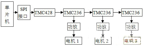 本系統(tǒng)采用MCS51單片機(jī)作為微處理器,用于系統(tǒng)的控制和指令發(fā)布,這是整個(gè)控制系統(tǒng)的核心,系統(tǒng)的各種邏輯和數(shù)量計(jì)算都有單片機(jī)完成。由于系統(tǒng)采用SPI串行通信方式,而51單片機(jī)本身不帶有SPI接口,所以在單片機(jī)與TMC428必須獨(dú)立SPI專(zhuān)用接口模塊進(jìn)行數(shù)據(jù)轉(zhuǎn)換,這里采用 MCP2510 SPI接口芯片。上電以后,單片機(jī)首先對(duì)TMC428進(jìn)行初始化,設(shè)置初始的位置、速度以及加速度等運(yùn)動(dòng)參數(shù),并且配置菊花鏈串行通信數(shù)據(jù)和微步表。由于運(yùn)動(dòng)參數(shù)被配置在TMC428的功能寄存器中,在工作過(guò)程中可以根據(jù)實(shí)際要求在線更改以適應(yīng)實(shí)際運(yùn)動(dòng)過(guò)程,而菊花鏈串行通信數(shù)據(jù)和微步表是存放在片內(nèi)RAM中,上電以后這些參數(shù)一般不能更改,所以在初始化時(shí)要對(duì)這些參數(shù)進(jìn)行精確計(jì)算。采用3個(gè)TMC236構(gòu)成一個(gè)菊花鏈,每個(gè)TMC236 控制一個(gè)步進(jìn)電機(jī),當(dāng)初始化完成后,TMC428可以脫離單片機(jī)自動(dòng)地把控制數(shù)據(jù)發(fā)送給TMC236實(shí)現(xiàn)對(duì)電機(jī)的控制,但由于TMC236所發(fā)出的控制信號(hào)比較弱,不足以驅(qū)動(dòng)電機(jī),所以在TMC236發(fā)出的控制信號(hào)必須進(jìn)過(guò)功率放大才能驅(qū)動(dòng)電機(jī)。系統(tǒng)結(jié)構(gòu)如圖二所示。