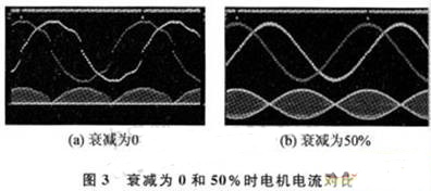 步進電機的細分控制,從本質(zhì)上講是通過對步進電機勵磁繞組中電流的控制,使步進電機內(nèi)部的合成磁場為均勻的圓形旋轉(zhuǎn)磁場,從而實現(xiàn)步進電機步距角的細分。一般情況下,合成磁場矢量的幅值決定了步進電機旋轉(zhuǎn)力矩的大小,相鄰兩合成磁場矢量之間的夾角大小決定了步距角的大小。DCY2、DCY1外接撥碼開關(guān)設(shè)置電流衰減模式(0、25%、50%、 100%),用于滿足不同的步進電機需要。由于電機本身狀況、供電電源狀況及脈沖頻率等其他因素的影響,步進電機可能會產(chǎn)生高頻噪聲,通過電流衰減模式的設(shè)置可減小甚至消除這種噪聲。圖3顯示了衰減模式為0和50%時線圈電流的變化,可看出波形具有明顯的改善。