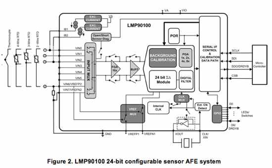 總之,溫度傳感器需要偏置(電壓或者電流)。使用熱電偶時,需要冷結(jié)溫補(bǔ)償。TI擁有一整套解決方案,可以滿足這些要求。LMP90100是一種24位傳感器AFE系統(tǒng),擁有四個差動輸入或者七個單端輸入,兩個匹配可編程電流源,以及連續(xù)本底校準(zhǔn)(圖2)。LMP90100是一款集成可配置芯片,是克服各種溫度傳感器相關(guān)設(shè)計挑戰(zhàn)的理想選擇。