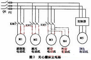 M型磨床由五臺(tái)交流電動(dòng)機(jī)驅(qū)動(dòng),其中一臺(tái)電動(dòng)機(jī)需無(wú)級(jí)變速控制,用變頻器控制該臺(tái)電動(dòng)機(jī)得到無(wú)級(jí)變速。主控電機(jī)控制的對(duì)象分別是潤(rùn)滑、冷卻、磨削輪、液壓和導(dǎo)輪。