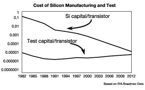圖1. 來自SIA的數(shù)據(jù)表明:隨著時(shí)間推移,硅(或者器件功能)的成本在降低,但測試成本卻在持續(xù)增加。