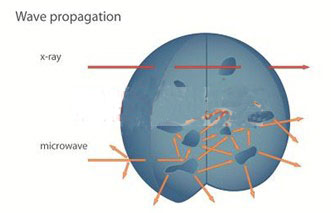 微波診斷與其它的醫(yī)學(xué)影像技術(shù)本質(zhì)上差別很大。X射線直接穿過(guò)檢測(cè)部位,而超聲儀則利用了聲波的反射。但微波診斷技術(shù)利用的是微波在體內(nèi)的散射(圖2)。這臺(tái)儀器使用了一個(gè)接有許多天線的裝置;使用儀器時(shí),這個(gè)裝置被戴在頭上。每根天線每次傳輸一個(gè)聲波信號(hào)給信號(hào)采集器,與此同時(shí),其它的天線會(huì)接收信號(hào)。這項(xiàng)技術(shù)的另一個(gè)優(yōu)勢(shì)在于,它的部件非常緊湊,可以方便的在健康護(hù)理鏈的前端——急救室或救護(hù)車(chē)內(nèi)——使用。