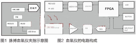 血氧儀一般包括血氧飽和度檢測模塊,主控制器,血氧檢測探頭三個主要部分,典型結(jié)構(gòu)如圖2。